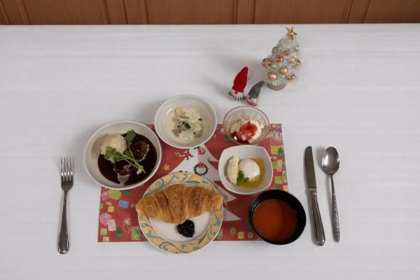 | 12月25日(月)、2年ぶりに「クリスマスディナーパーティー」を開催しました。今年1年を明るい気持ちで締めくくっていただければと、いつも以上に煌びやかな飾りつけを行い、ゲストによる生演奏とフランス料理のフルコースを召し上がっていただきました。また、今年は職員からのハンドベルの演奏もサプライズとして行わせていただきました。感染対策の為、ご家族の方にご参加いただくことはできませんでしたが、多くのご利用者が笑顔で楽しんでいただけたことを職員一同、安堵しております。 |