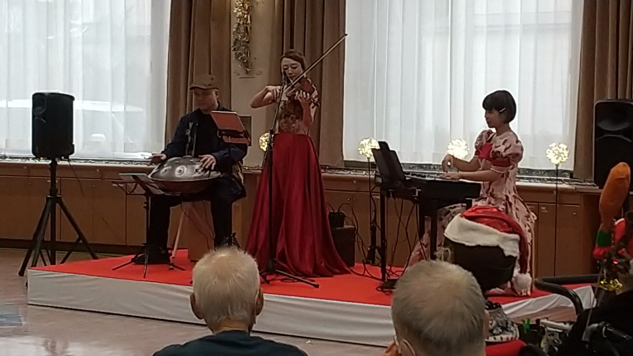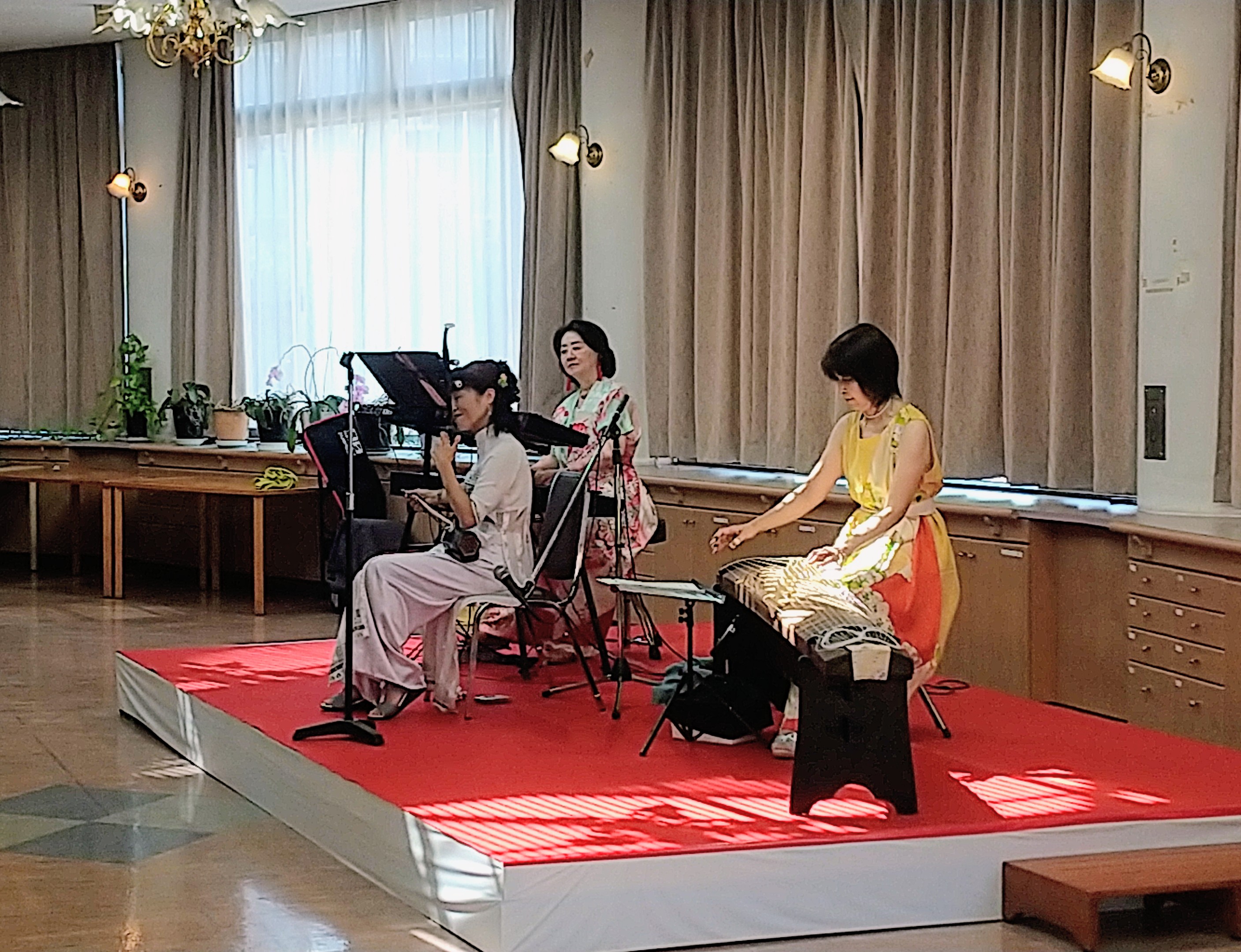 | 令和7年9月15日(月)に当施設で「敬老会イベント」が開催されました。アジアンユニット「ジャスミン」の方々をお迎えし、シンセサイザー 二胡 箏が織りなす、心地よい音色に酔いしれて午後のひと時でした。昼食は、天ぷらランチを召し上がっていただきました。 |