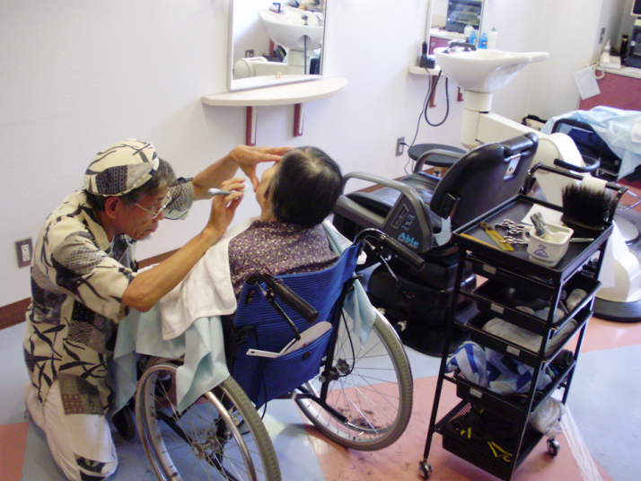 当施設内で週に一度、理美容のサービスを行っております。事前にご予約いただくと、隔週どちらかのサービスをご利用いただけます。カットはもちろん、理容では顔そり、美容では毛染め・パーマも行います。