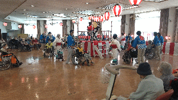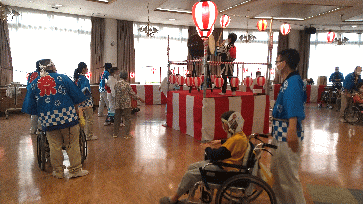 | 令和7年8月6日(水)に当施設で「星ヶ丘アメニティクラブ盆踊り大会」が開催されました。施設内に櫓を組み、踊りの先生方を迎え、皆さん楽しく踊りに参加して頂けました。家族の方も参加していただき、賑やかな盆踊り大会となりました。昼食は、夏祭りのランチを召し上がっていただきました。 |